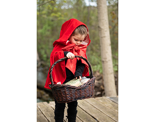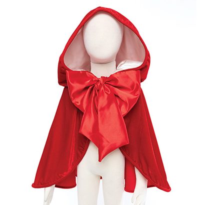 Capa clàssica de velour vermell suau amb caputxa àmplia i llaç gran de setí. Inspirada en Caputxeta Vermella, totalment rentable amb botó de velcro funcional. .