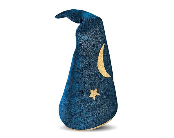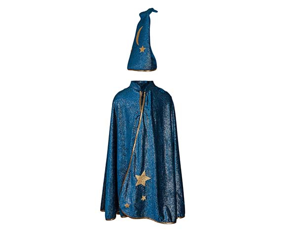 Capa màgica de color turquesa amb detalls d’estrelles i lluna, acompanyada d’un barret punxegut a joc. Ideal per a petits embruixadors i aventures nocturnes.