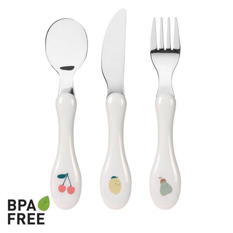 El joc de forquilla i cullera està fet d’acer inoxidable no deformable amb mànecs de plàstic. Els coberts per a nens són lleugers, estables i aptes per a rentavaixelles, són ideals per a nens a partir d’1 any.
