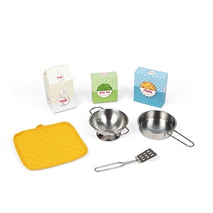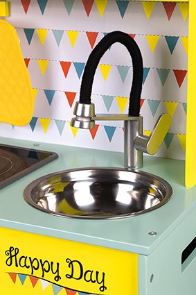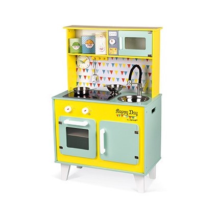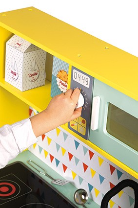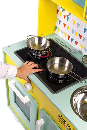 Fes com el pare i la mare i prepara uns plats boníssims. Cuina de fusta amb ganxos per a penjar el cullerot, l’escumadora i un colador de metall. Equipada amb una placa d’inducció sonora de LED: prem el botó vermell i s’engega la placa i si prems una segona vegada sentiràs el soroll de l’aigua bullint. El so s’apaga automàticament al cap de 30 segons o prement el botó per tercera vegada. No li falta un forn, un microones,un armari amb portes magnètiques i una pica d’acer inoxidable i un rellotge. Porta 3 caixes de cartró.
