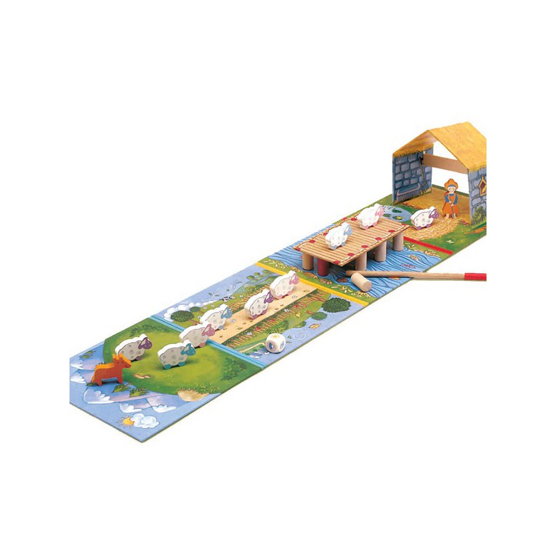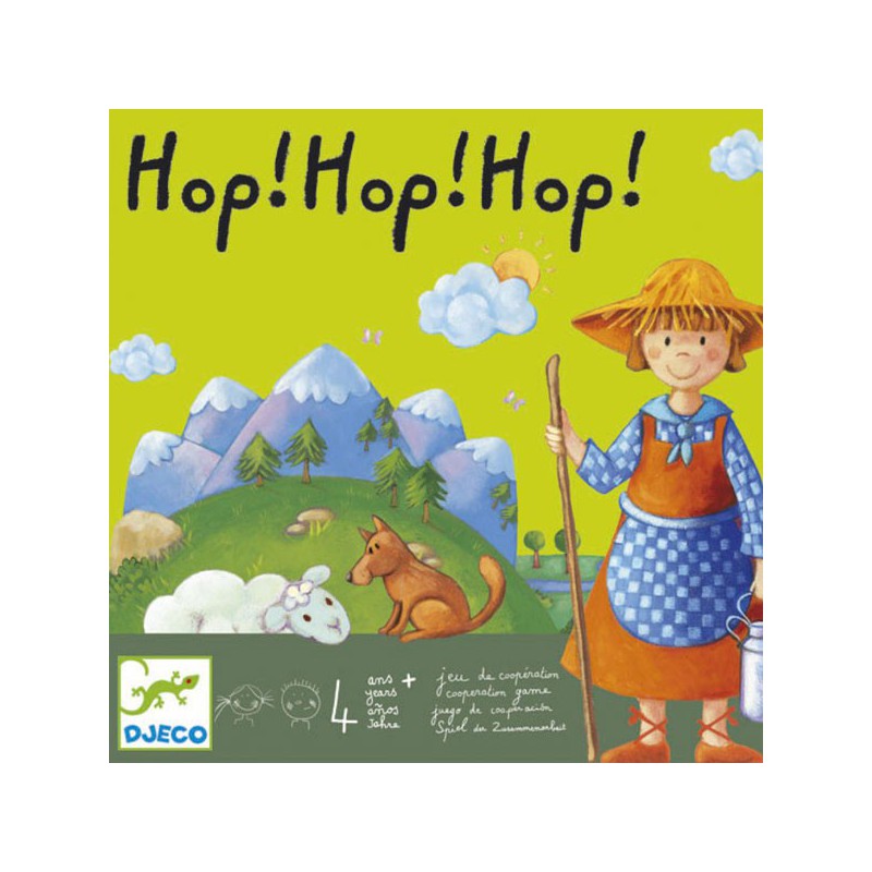 Hop! Hop! Hop! és un joc cooperatiu. La pastora, les seves ovelles i el seu gos han de tornar al refugi abans que el vent s’emporti el pont per l’aire. Podran cooperar els jugadors per portar a totes les ovelles cap al corral?
