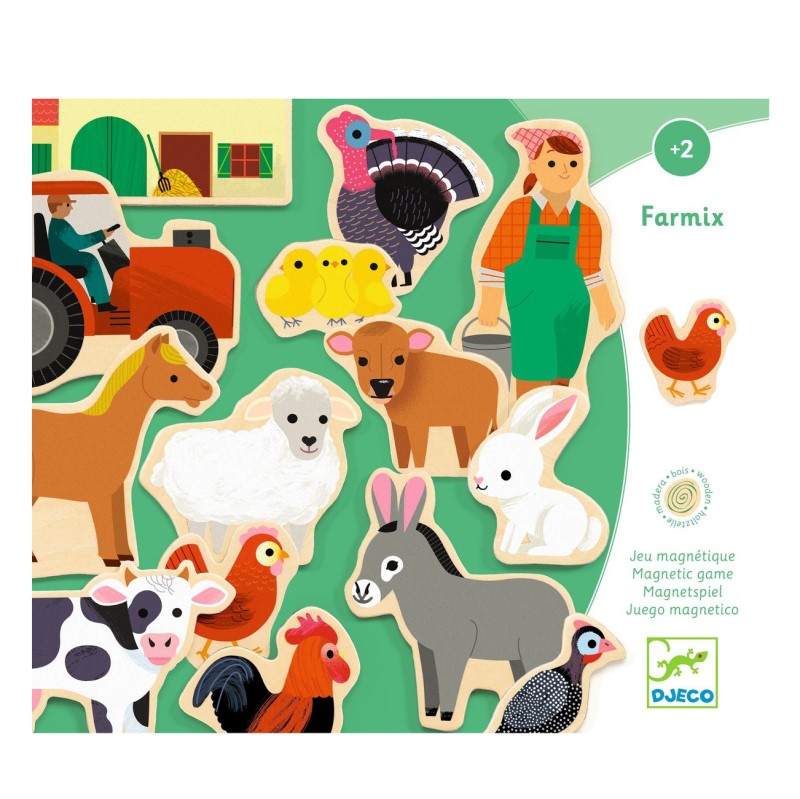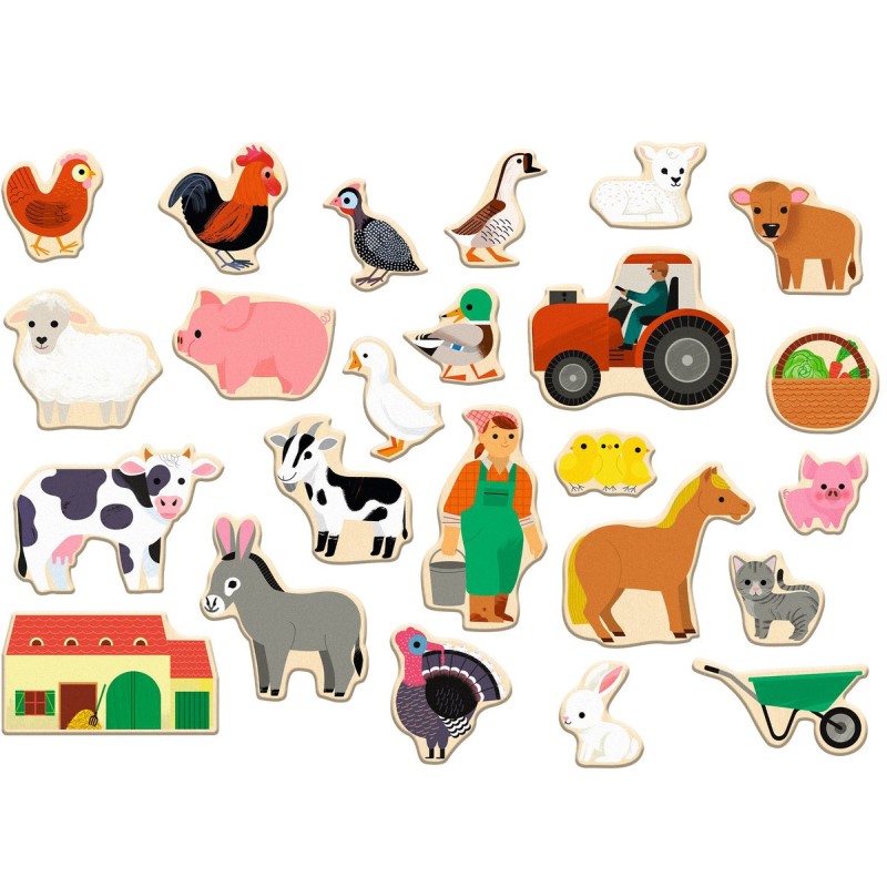 Diverteix-te amb el granger i el seu tractor, la granja, la cabra, la vaca, la gallinaaixí fins a 24 peces de fusta amb imant. Aquestes il·lustracions acolorides i atractives encantaran als més petits i podran crear la seva pròpia granja en qualsevol superfície magnètica.