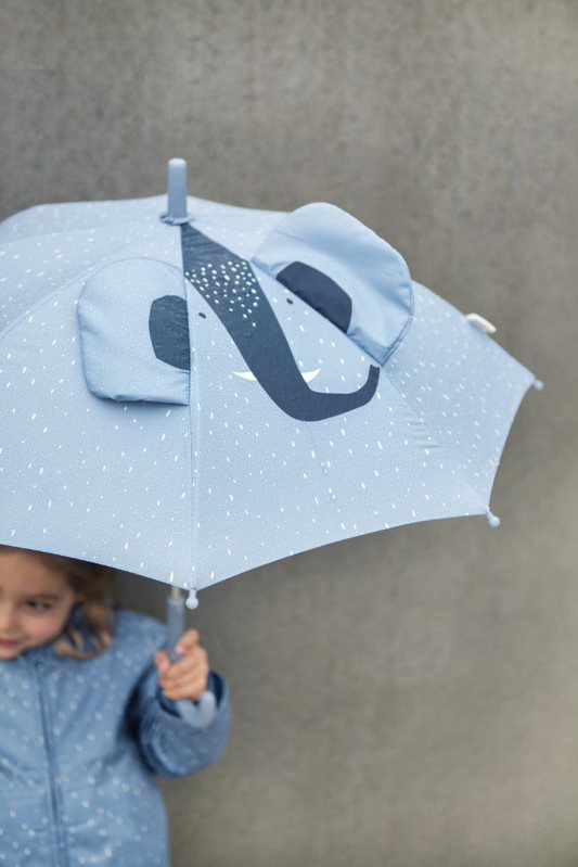 Paraigües Mrs. Elephant fet 100% de polièster reciclat. El sistema lliscant per a obrir i tancar el paraigües està especialment dissenyat per a les mans dels més menuts de manera que el puguin fer servir de forma suau i segura. L’estructura és d’alumini resistent, d’alta qualitat i molt lleuger. Quan el sol torni a brillar, pots tancar el paraigües amb la cua de l’animal!