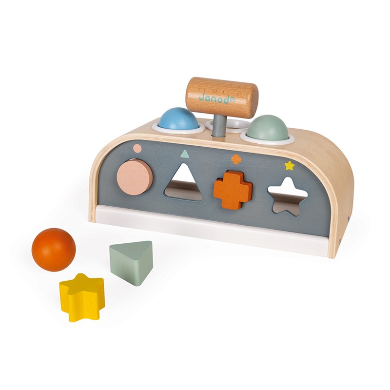 Joc d’habilitat que permet desenvolupar l’agilitat i la coordinació. 3 activitats en 1: colpejar les 3 boles amb el martell, reconèixer les 4 formes diferents i aprendre els colors amb el joc d’encaix i formes.