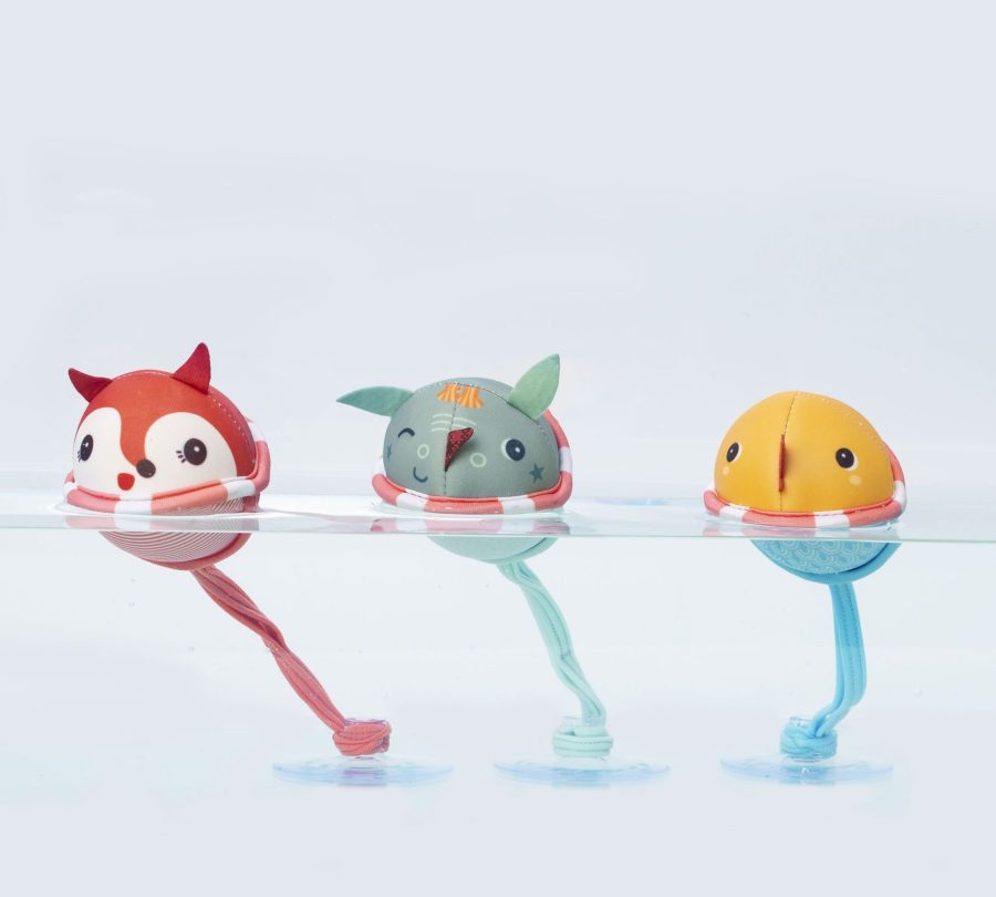 Tres divertides i acolorides pilotes de neoprè que es fixen fàcilment amb una ventosa a la banyera i queden sempre flotant al seu abast.