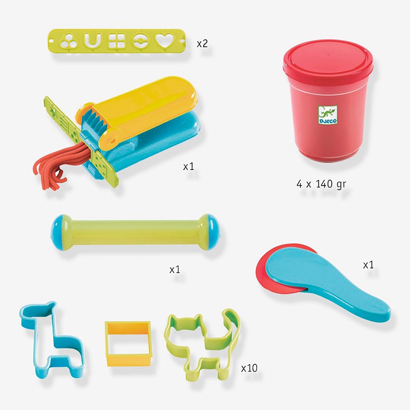El set inclou 4 pots de plastilina de 140 g (verd, blau, groc i vermell), 10 motlles, 1 corró, 1 tallador, 1 premsa i 2 plantilles amb 10 formes diferents.