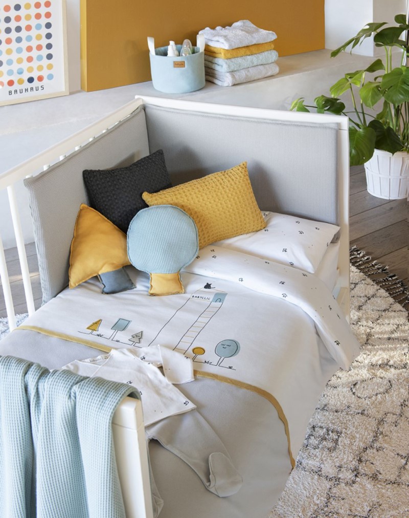 Protector per a bressol de Babyclic. Pots combinar-lo amb diferents col·leccions. Reversible (una cara gris i l’altra verda).