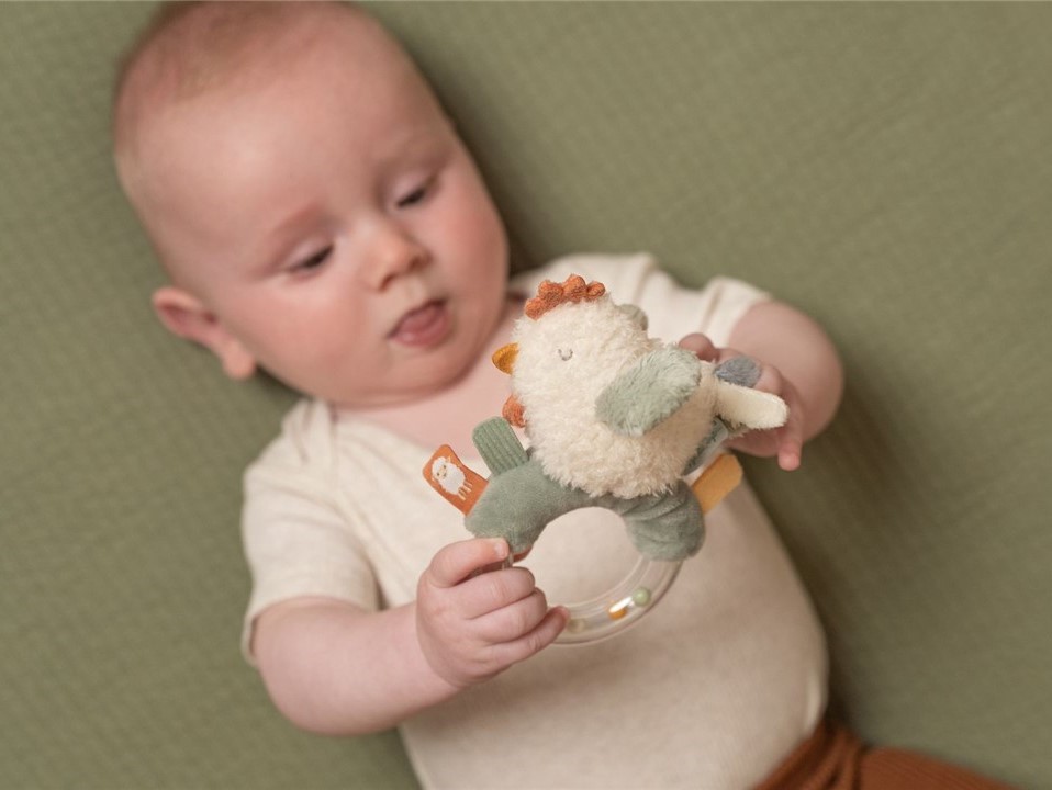 Sonall amb anella transparent amb tres boletes que fa soroll a l’agitar. Estimula els sentits i afavoreix la coordinació ma-ull.