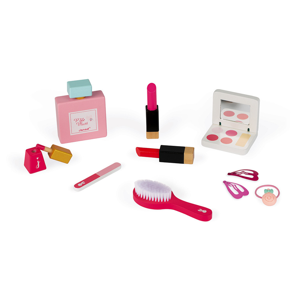 Posa’t encara més guapa asseguda còmodament sobre el teu tamboret davant del Tocador Petita Miss. Aquest tocador d’aspecte realista està equipat amb un gran mirall per poder veure’t millor i un calaix perquè guardis els accessoris i els petits secrets. Pràctic, compta amb 3 ganxos per penjar collarets o polseres. Inclou 10 accessoris de bellesa i perruqueria: 1 raspall de cabells, 2 clips per als cabells, 1 goma de cabell, 1 pot de perfum, 1 paleta de maquillatge, 1 llima, 1 esmalt d’ungles i 2 pintallavis.