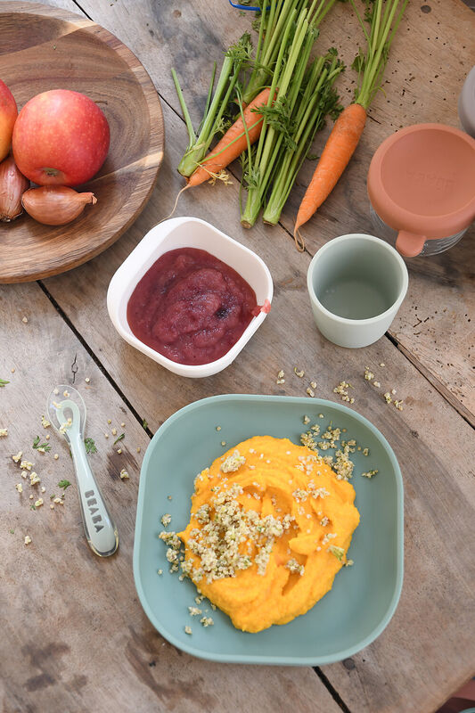 • Inclou 4 peces: plat amb ventosa de succió antilliscant, bol  amb ventosa de succió antilliscant, tassa antilliscant, cullera de silicona de la 2a etapa